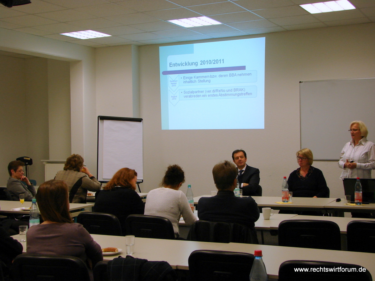 Am Freitagabend trafen sich interessierte FORUM-Teilnehmerinnen und -Teilnehmer sowie Vertreter des Berliner Oberstufenzentrums Recht zu einer Diskussion unter dem Motto „Eine moderne Zukunft der/des RENO-Fachangestellten“. Kollegin Stefanie Reichert informierte zunächst über den aktuellen Stand der Verhandlungen der Sozialpartner zur Novellierung der Ausbildungsverordnung der/des RENO-Fachangestellten, welche bereits weit vorangeschritten sind. Die Inhalte für die gemeinsame Grundbildung aller vier Ausbildungsberufe (Rechtsanwaltsfachangestellte/r, Notarfachangestellte/r, Patenfachangestellte/r sowie Rechtsanwalts- und Notarfachangestellte/r) sind weitgehend definiert. Derzeit arbeiten kleinere Arbeitsgruppen an der Formulierung der spezifischen Ausbildungsinhalte der Einzelberufe. Das Ziel, die neue Ausbildungsverordnung schon 2013 zu verabschieden, dürfte erreicht werden können. In der anschließenden Diskussion, welche in gewohnter Weise von Herrn Rechtsanwalt Sittner moderiert wurde, beantworteten die an den Novellierungs-Verhandlungen beteiligten Kolleginnen Reichert, Stern und Sorge zahlreiche Fragen des Auditoriums und nahmen viele Vorschläge für die weitere Arbeit an der Ausbildungsordnung auf, so unter anderem zur Gestaltung praxisorientierter Prüfungen. Einig war man sich allerdings auch bei der diesjährigen Diskussion, dass eine Novellierung des Berufsbildes allein unseren Beruf nicht attraktiver macht. Wichtig ist auch eine leistungsangemessene Vergütung.